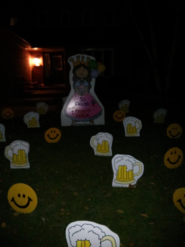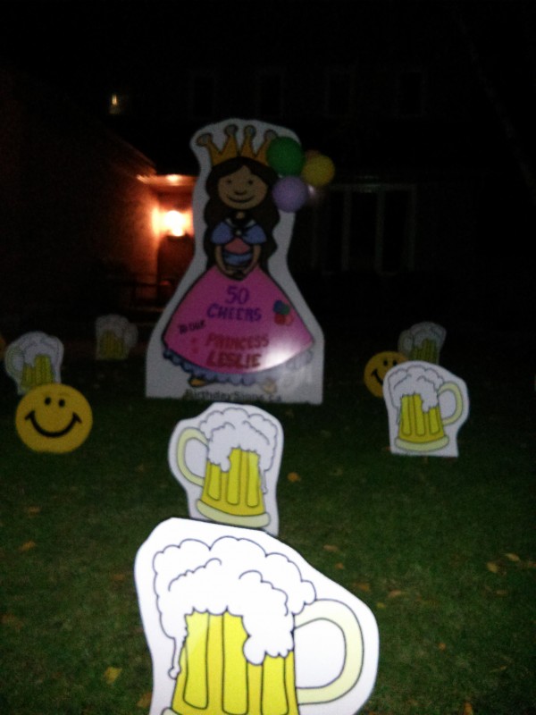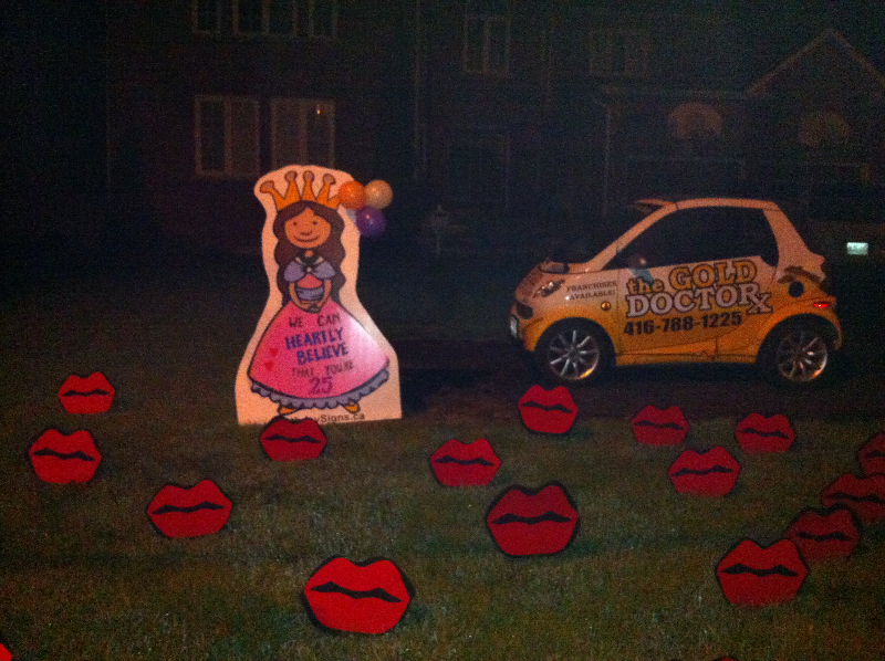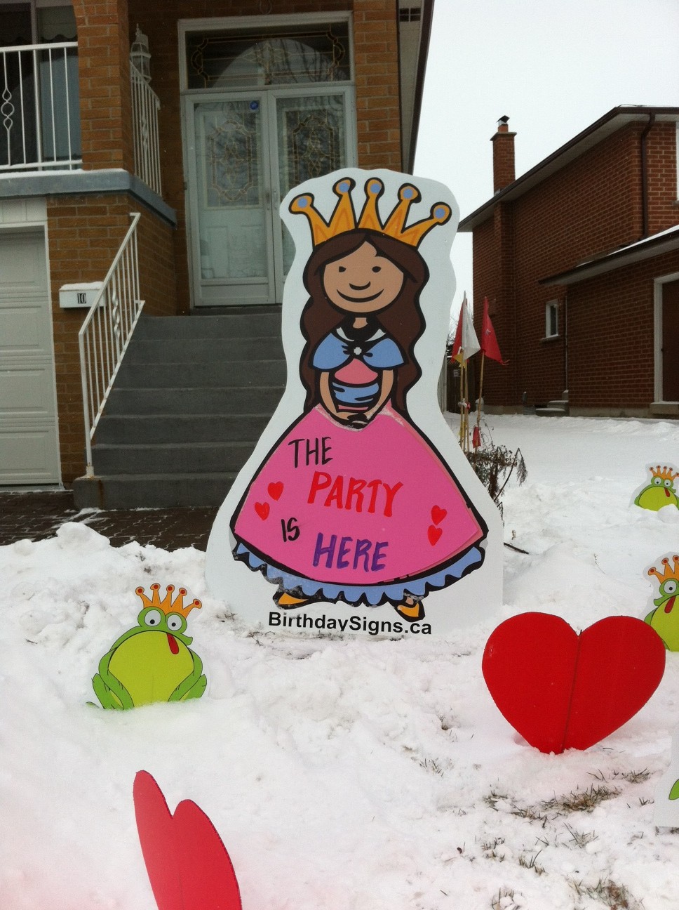 Our Princess Lawn Signs is a popular lawn sign for all occasions. This lawn sign stands about 5 feet tall and 3 feet wide. The Princess lawn sign was designed by a local graphic artist and printed on light weight durable 10 mil coraplast . The Princess can stand on grass , pavement or even in an office. The princess comes with a personalized message and can be used for many occasions like a birthday , sweet 16, anniversary , promotion and retirement. Choose the lawn ornaments to surround the Princess lawn sign like the frogs, flamingos , hearts , soccer balls .There are lots to pick from so have a look here. Below you can see some pictures of some of our displays with the Princess Lawn Sign. There are so many combinations of lawn ornaments that can be used to create the ultimate lawn greeting. You can check our message centre for help with the greeting or simply give us a call at 647 894 7446. Please see our pricing page for our delivery and pick up options.