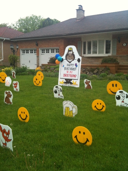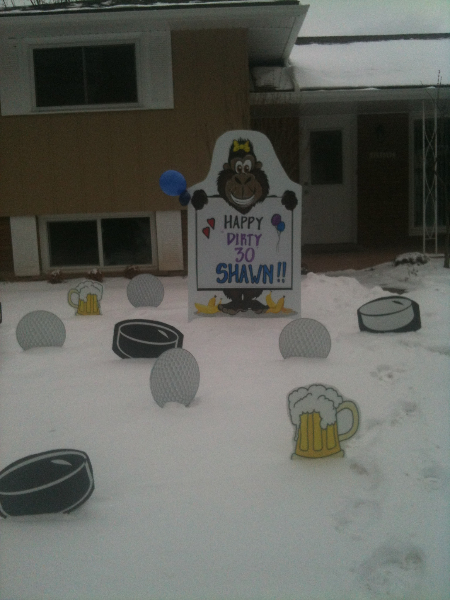 Our Gorilla Lawn Sign is a popular lawn sign for all occasions. This lawn sign stands about 5 feet tall and 3 feet wide. The Gorilla Lawn Sign was designed by a local graphic artist and printed on light weight durable 10 mil coraplast . It can stand on grass , pavement or even in an office. The Gorilla sign comes with a personalized message and can be used for many occasions like a birthday , sweet 16, anniversary , promotion and retirement. Choose the lawn ornaments to surround the gorilla like the flamingos , hearts , beer mugs , smiley faces . There are lots to pick from so have a look here.